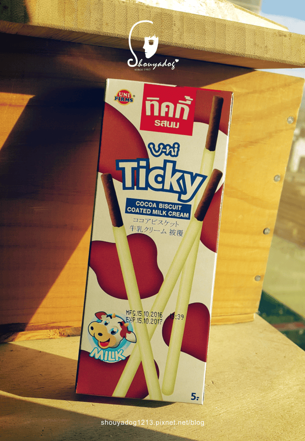 這次在即期良品店發現的零食是這個,來自泰國的Ticky奇趣棒餅。 看包裝上面的形容,應該是巧克力口味的棒棒餅乾外面包覆著的是牛奶口味的包覆物XD 沒吃過泰國的,買了兩盒來吃吃 反正小細菌…